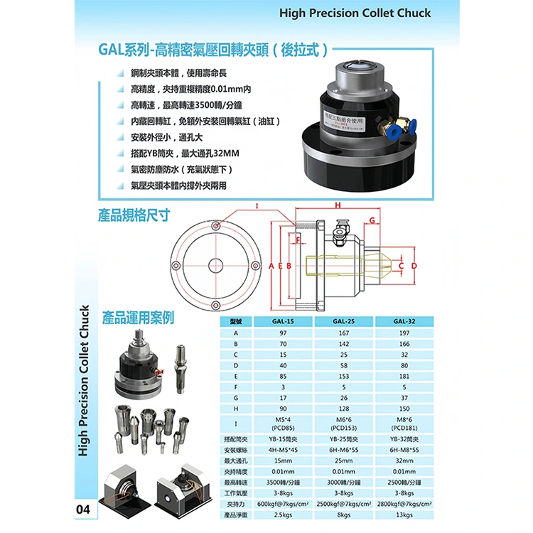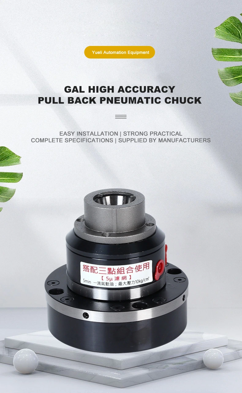O Gal-25 é um mandril pneumático rotativo de alta velocidade. Pertence a uma espécie de mandril pneumático, frequentemente usado na usinagem CNC, máquina de retificação de precisão e outros equipamentos de usinagem de precisão, com alta precisão de aperto, pode alcançar um aperto estável da peça de trabalho, ajudar o processo de processamento automático