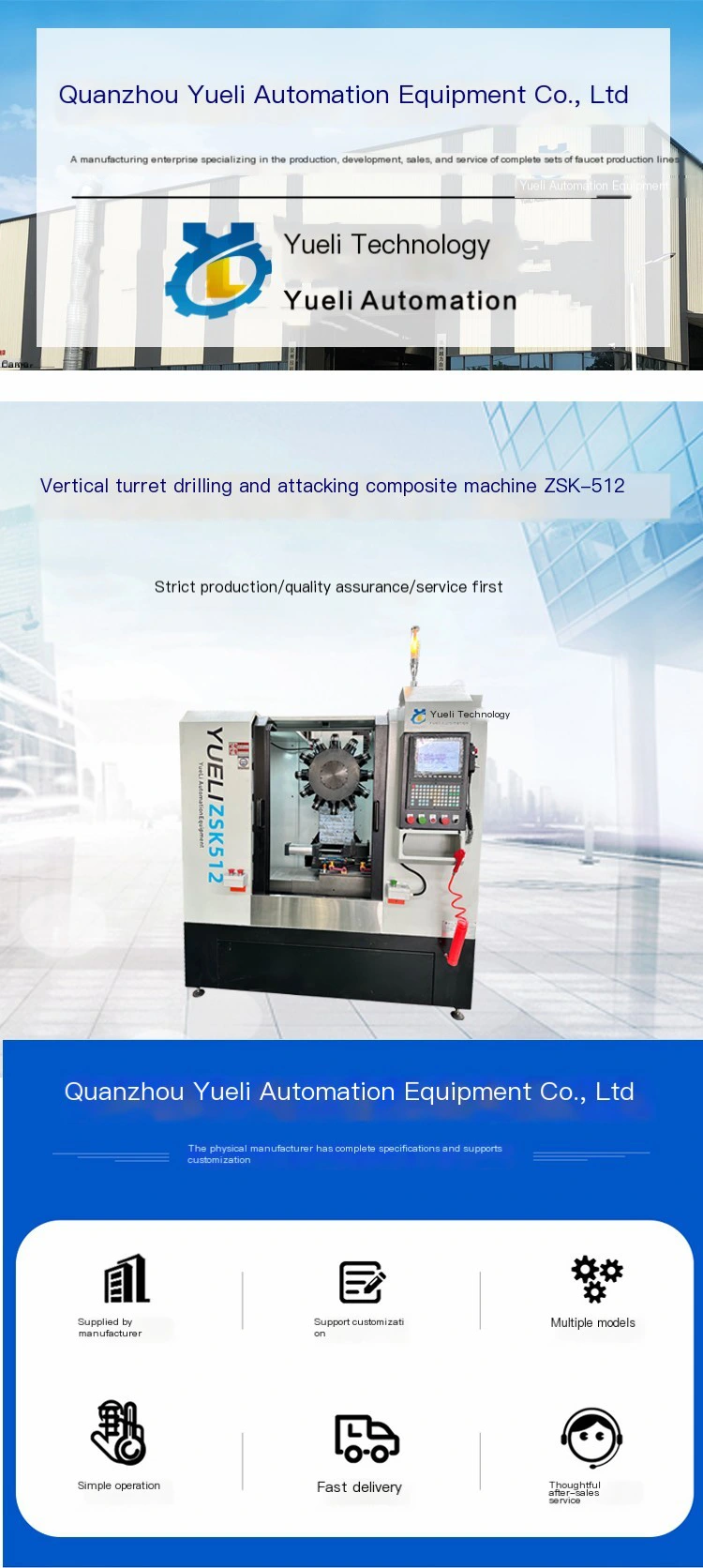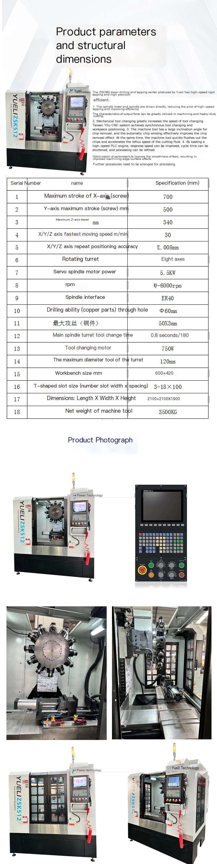 Yueli produz centro de perfuração e tapping da torre ZSK580 com batida rígida de alta velocidade, alta precisão e alta eficiência.
